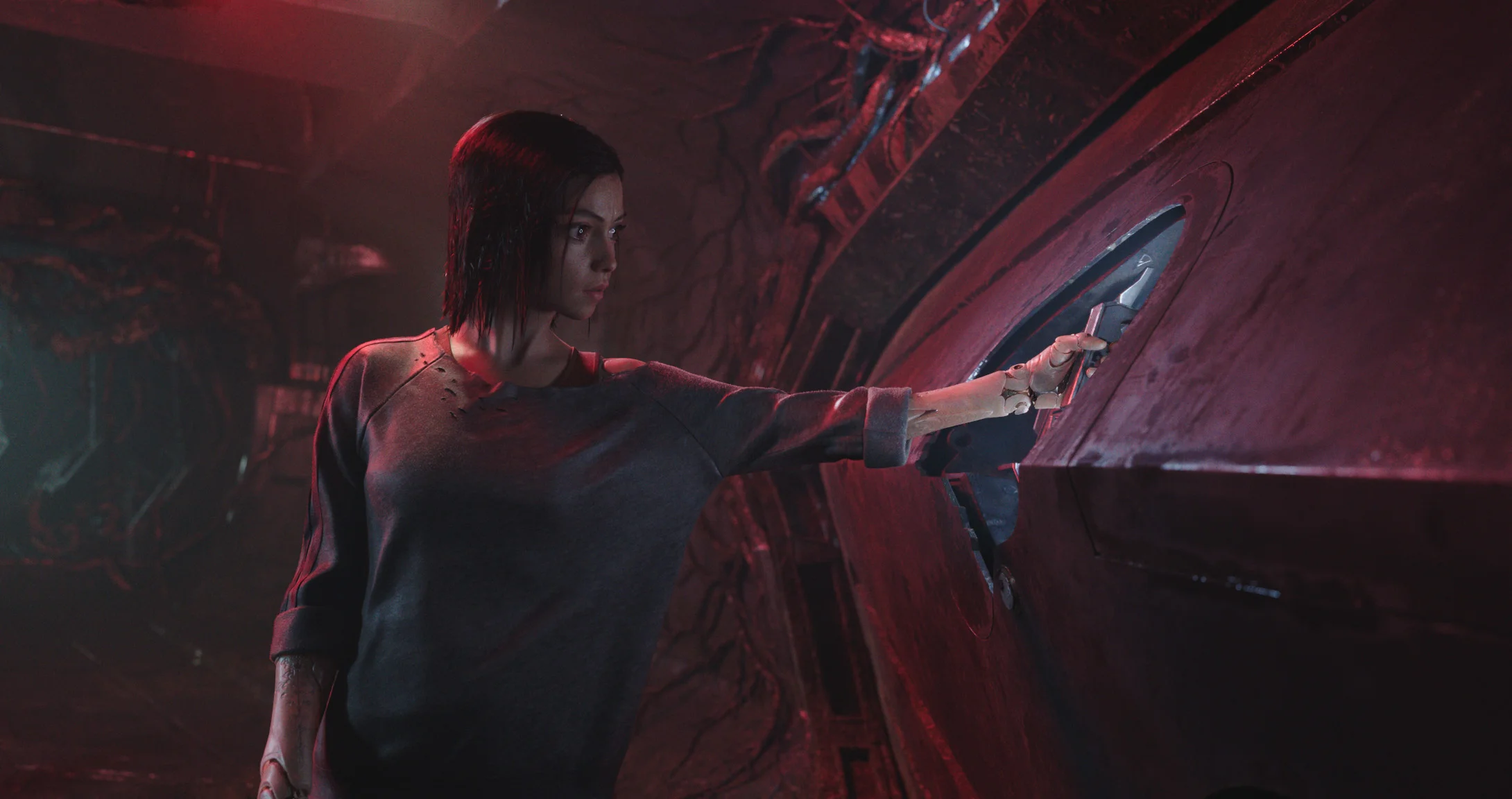 Alita looks like a normal teen girl, except for her enormous eyes, which take in her surroundings with a measure of curiosity and innocence. The eyes are evocative of Japanese anime style, but also have the haunted look of a Margaret Keane painting — and that mix of emotions is how Rosa Salazar, who deftly provides the voice and body performance to Alita, plays the character.